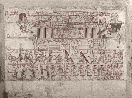 This scene on the southern wall of the rock-cut chamber is rich in detail and clues to our understanding of Niankhkhnum and Khnumhotep. Khnumhotep sits above on the right side holding a lotus flower and facing his companion Niankhkhnum who sits on the left side. Sitting behind Niankhkhnum are faint traces of his wife but her image was removed in ancient times by the designers of the tomb. Below the two men are musicians, dancers, clappers, and singers. To view details of the scene: click on the area you wish to enlarge. |