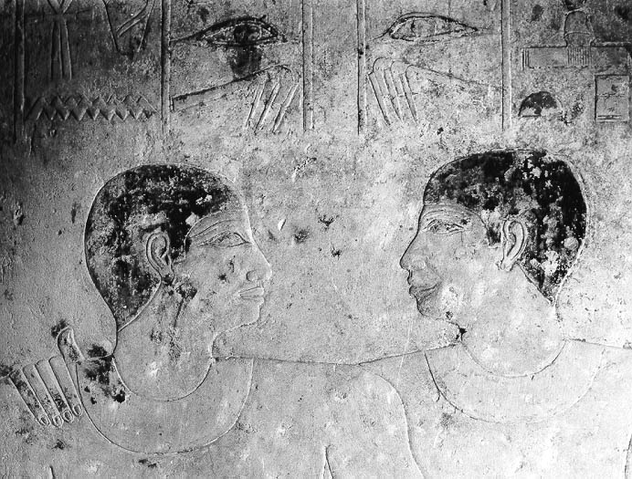 Niankhkhnum is on the left Khnumhotep the right. The two eyes and the claw shaped tools ( adze? gardening tool?) are the symbols designating the profession of manicurist.